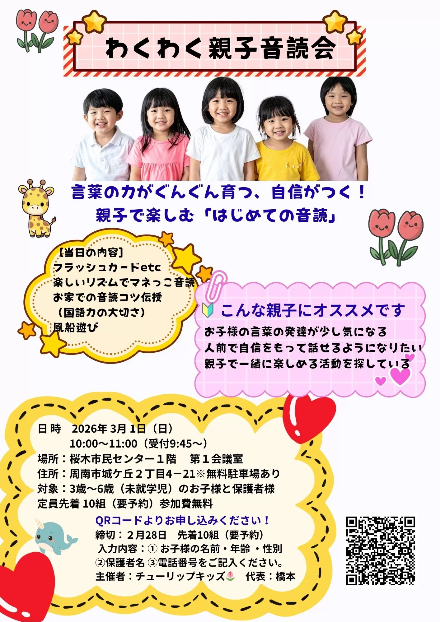 当塾の関連団体「チューリップキッズ」が、未就学児のお子様とその保護者様を対象とした音読会を、周南市にて開催します。