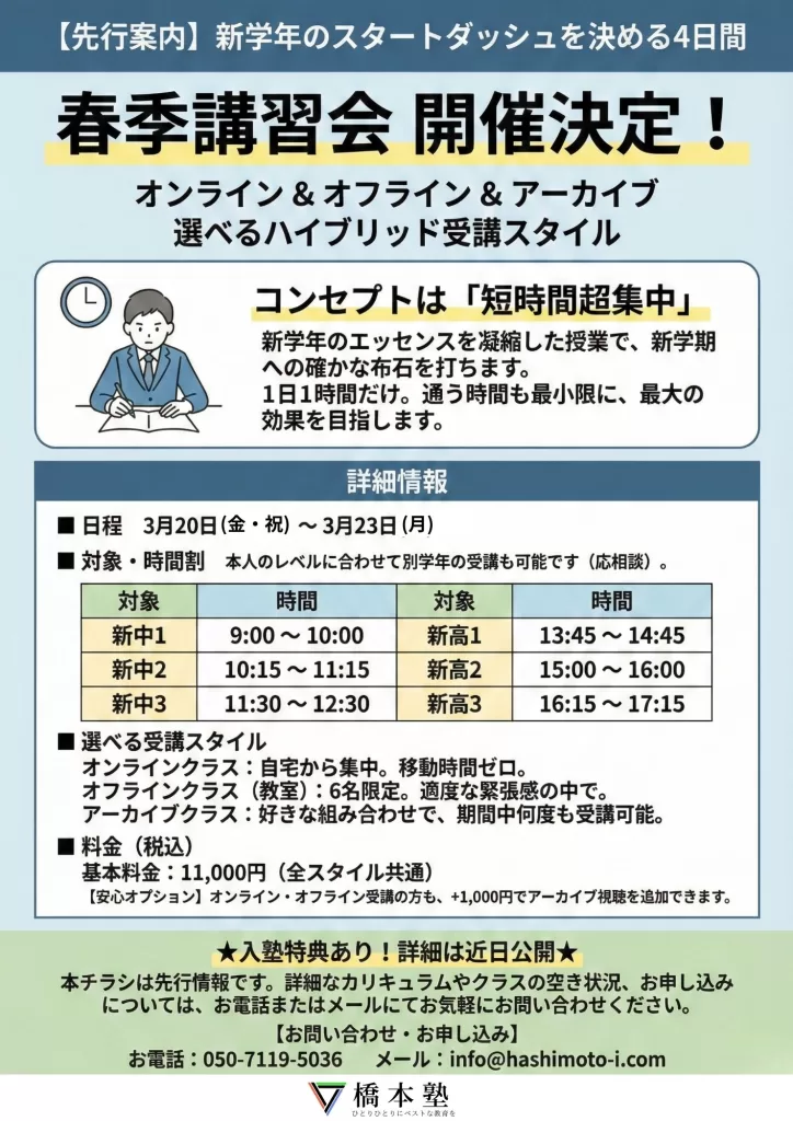 新学年の始まりは、期待と不安が入り混じる時期です。橋本塾では、忙しい春休みでも無理なく、かつ確実に力をつけられる「短時間超集中型」の講習を開催いたします。詳細は追って公表いたしますが、お問い合わせ・申込みにつきましては、本日より開始いたします。