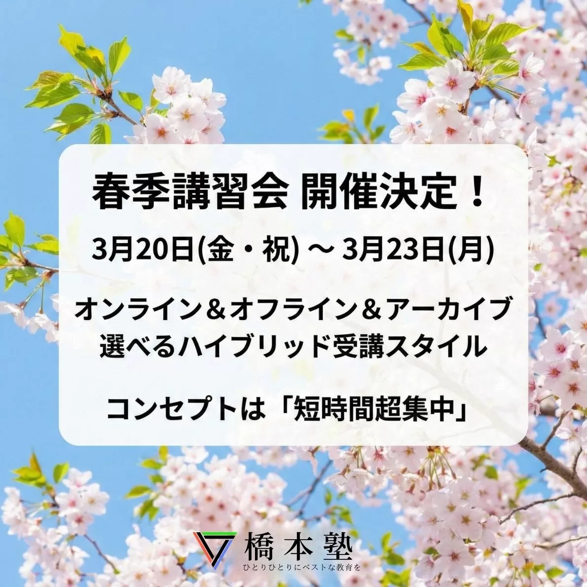 新学年の始まりは、期待と不安が入り混じる時期です。橋本塾では、忙しい春休みでも無理なく、かつ確実に力をつけられる「短時間超集中型」の講習を開催いたします。詳細は追って公表いたしますが、お問い合わせ・申込みにつきましては、本日より開始いたします。