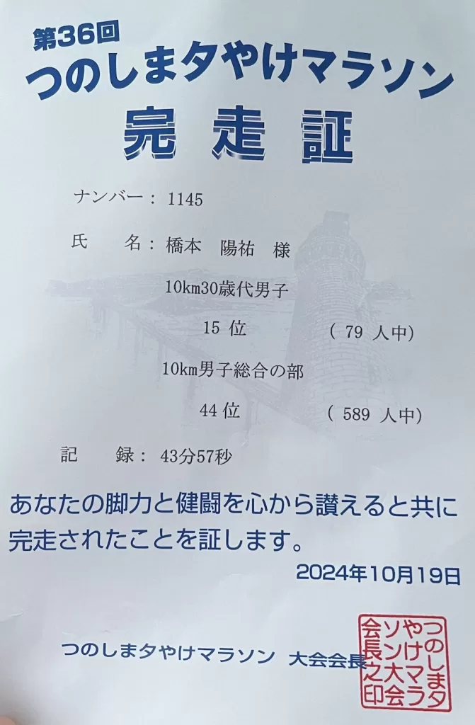 橋本塾代表の橋本陽祐が第36回つのしま夕焼けマラソン(10km)に出場し、完走しました。